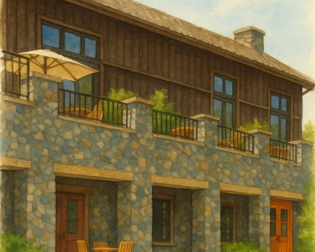 Timber House is located next to the Broad Axe Barn, just above the pool.